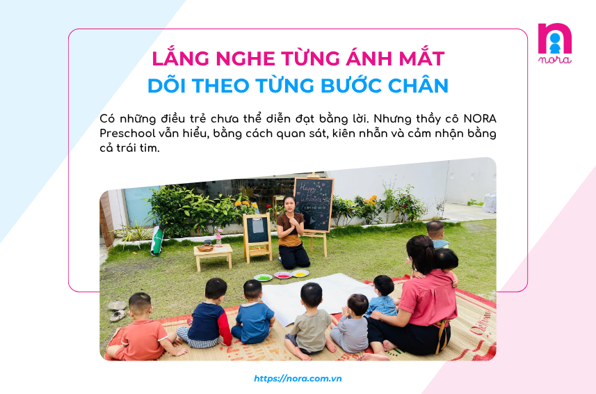 Việc chọn trường mầm non cho con là một cột mốc quan trọng, và NORA luôn sẵn sàng đồng hành cùng ba mẹ từ những thắc mắc đầu tiên. Nếu ba mẹ đang băn khoăn về chương trình học, môi trường, cách nuôi dưỡng sự tự lập cho con, hay đơn giản chỉ cần một lời khuyên phù hợp với tính cách của con, đừng ngần ngại nhắn cho NORA.