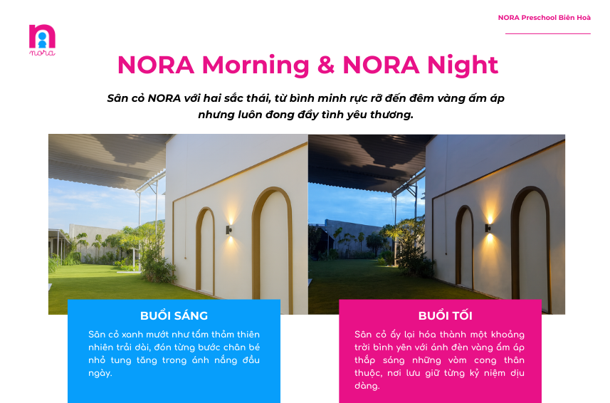 🌞 Buổi sáng, sân cỏ xanh mướt tại NORA như tấm thảm thiên nhiên trải dài, đón từng bước chân bé nhỏ …