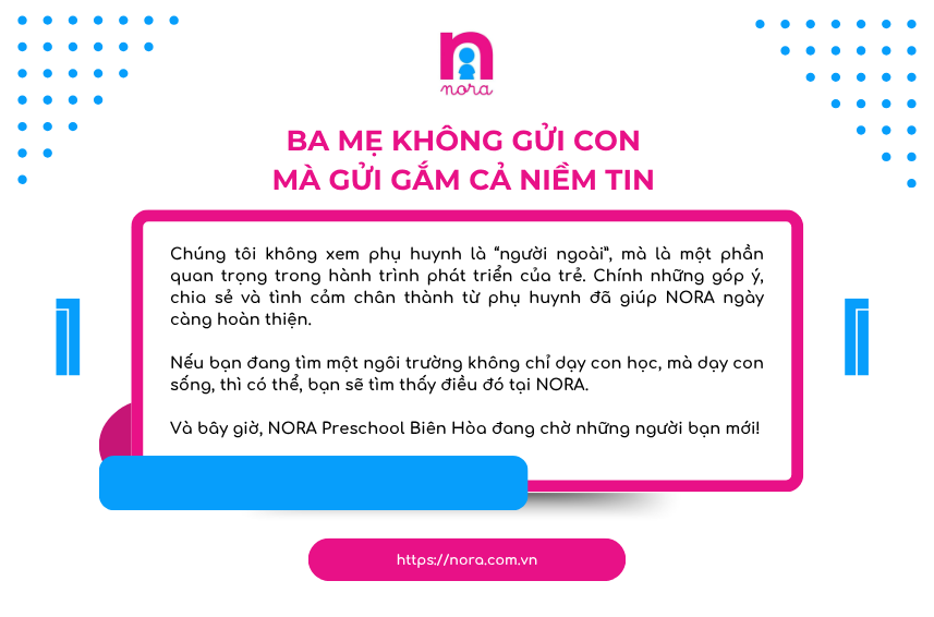 Việc chọn trường mầm non cho con là một cột mốc quan trọng, và NORA luôn sẵn sàng đồng hành cùng ba mẹ từ những thắc mắc đầu tiên. Nếu ba mẹ đang băn khoăn về chương trình học, môi trường, cách nuôi dưỡng sự tự lập cho con, hay đơn giản chỉ cần một lời khuyên phù hợp với tính cách của con, đừng ngần ngại nhắn cho NORA.