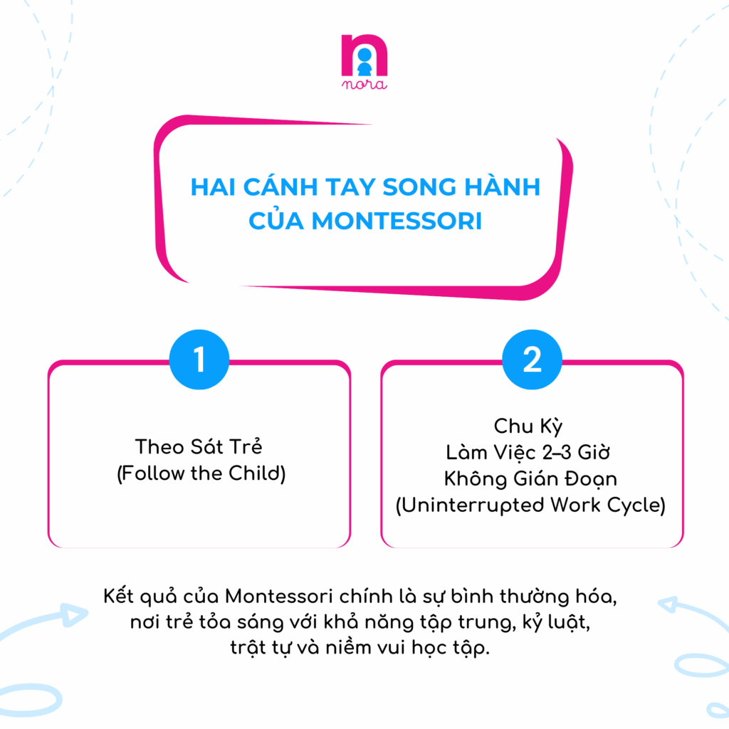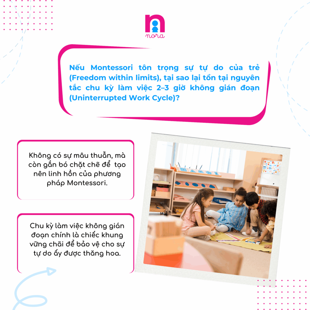 “Tự do của trẻ chỉ có ý nghĩa khi đi cùng với một môi trường được chuẩn bị (Prepared Environment) và một khoảng thời gian đủ dài để nuôi dưỡng sự tập trung sâu (Concentration). Chu kỳ làm việc không gián đoạn chính là chiếc khung vững chãi để bảo vệ cho sự tự do ấy được thăng hoa.“