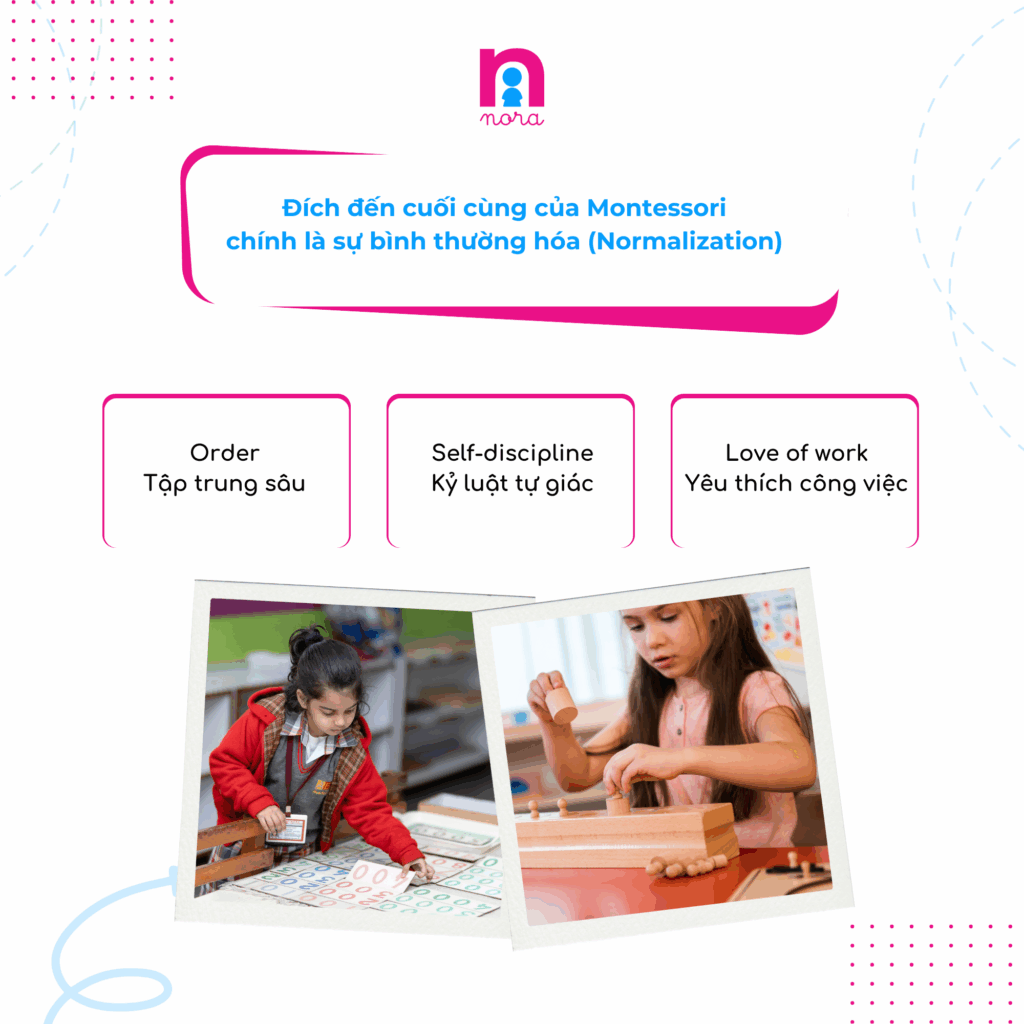 Đích đến cuối cùng của Montessori chính là sự bình thường hóa (Normalization). Đây là trạng thái khi trẻ đạt được khả năng tập trung sâu, thể hiện trật tự (Order), kỷ luật tự giác (Self-discipline) và niềm yêu thích công việc (Love of work). Trạng thái tuyệt vời này không thể ép buộc mà chỉ có thể nảy sinh một cách tự nhiên khi trẻ được tự do lựa chọn trong một môi trường được chuẩn bị cẩn thận, đồng thời được bảo vệ bởi khoảng thời gian làm việc dài và không bị ngắt quãng.