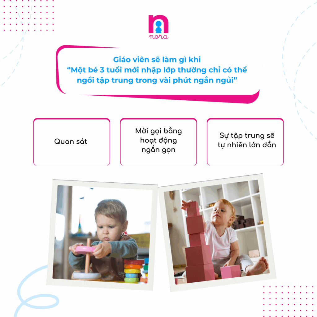 - Một bé 3 tuổi mới nhập lớp thường chỉ có thể ngồi tập trung trong vài phút ngắn ngủi. Nhiều giáo viên lo lắng, tự hỏi có nên ép con ngồi lại cho đủ chu kỳ hay không. Câu trả lời là không. Giáo viên Montessori sẽ quan sát, mời gọi trẻ bằng những hoạt động ngắn gọn, hấp dẫn, không áp lực, để con dần dần kéo dài được thời gian tập trung theo khả năng. Khi bé cảm thấy được tôn trọng và an toàn, sự tập trung sẽ tự nhiên lớn dần theo thời gian.